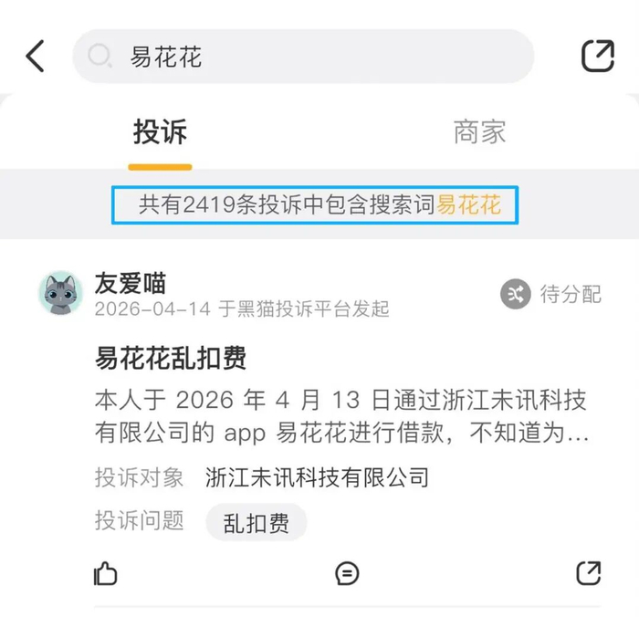 近期,新黄河了解到,一个名为易花花的借款平台陷入投诉“风波”,大量用户投诉其存在收取高额费用的问题。