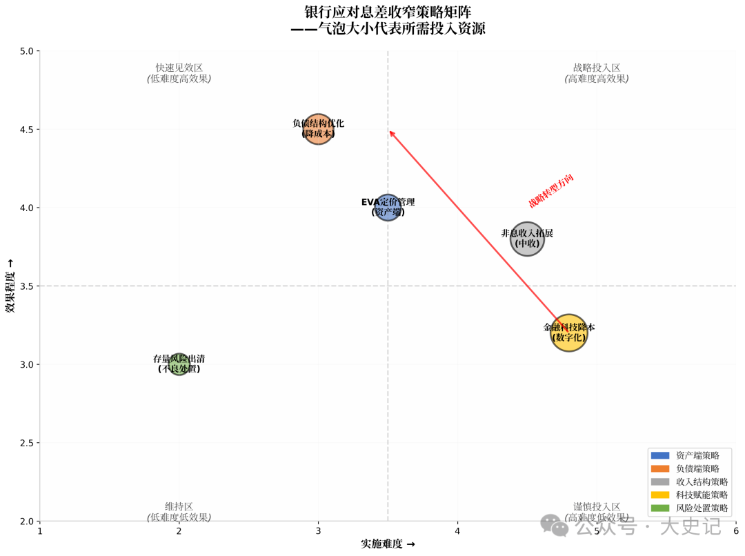 图4:银行应对息差收窄策略矩阵——气泡大小代表所需投入资源