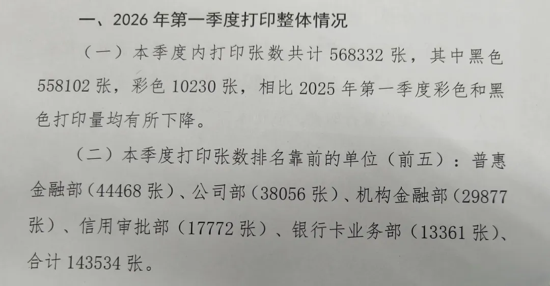 近期有一位网友透露,他们的银行公布了2026年第一季度打印的整体情况。