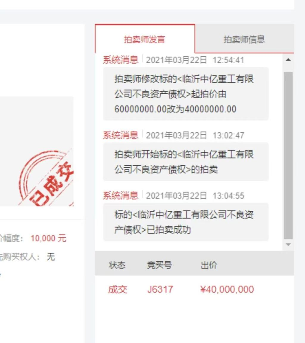 该债权拍卖记录显示,拍卖平台第一条系统消息是“2021年3月22日12:54:41 拍卖师修改标的<临沂中亿重工有限公司不良资产债权>起拍价由60000000.00改为40000000.00 ”。
