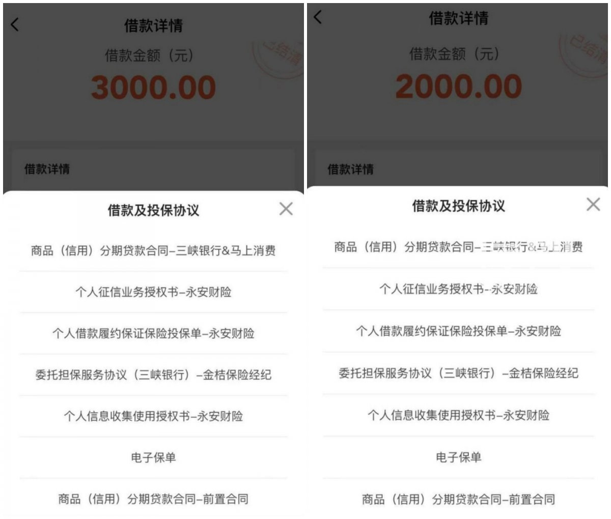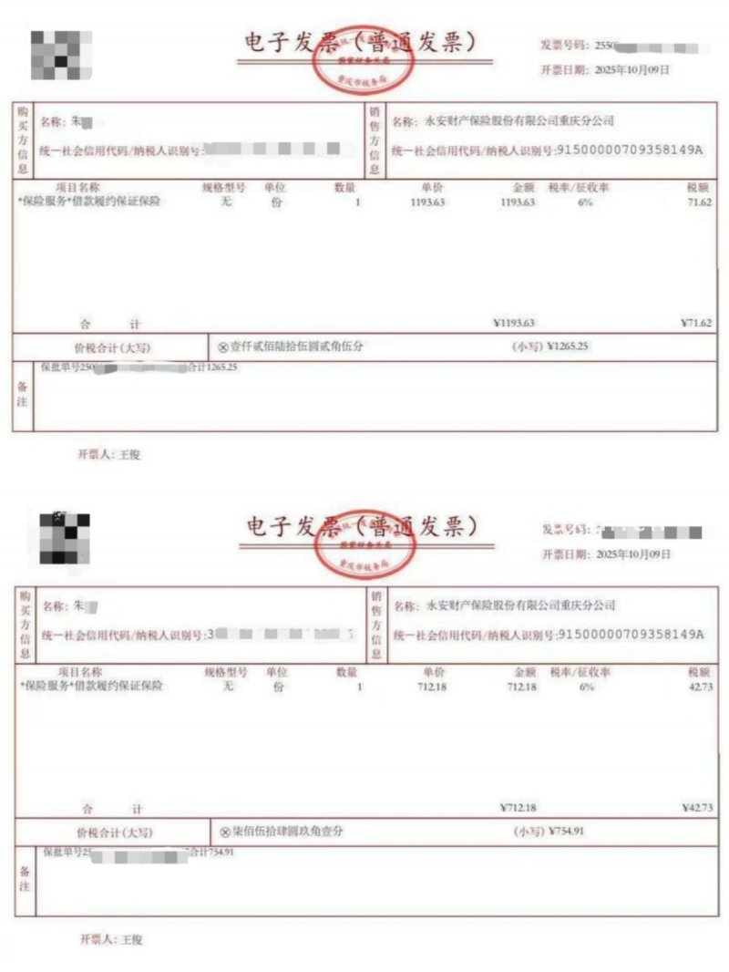 2020年12月至2021年4月,朱先生在翼支付平台办理的8笔网贷,均由马上消费金融与重庆三峡银行股份有限公司合作放款,借款总金额约2万元。“当时没人提过要买保险,贷款合同里也没明确写有保险相关费用。”2025年,朱先生要求放款方马上消费金融提供发票时,发现了永安财险重庆分公司收取了项目名称为“保险服务 借款履约保证保险”的费用。
