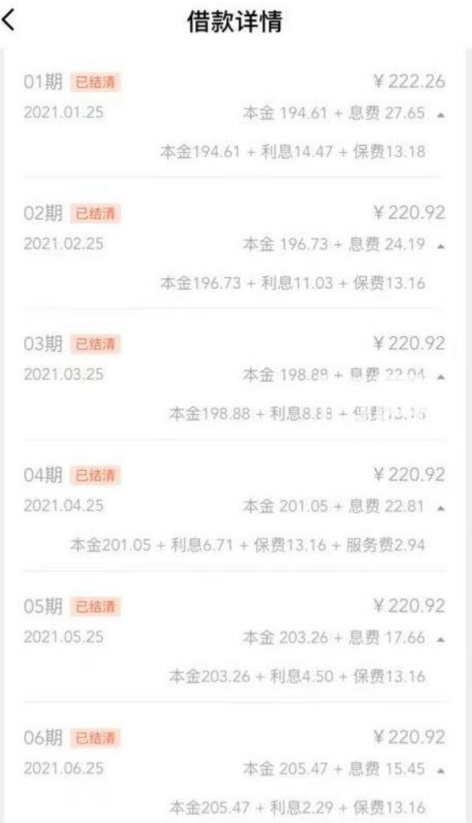 借款详情页面,保费隐藏在息费之中,若不点击三角形的三级菜单展开无法直接查看。(来源:受访者)