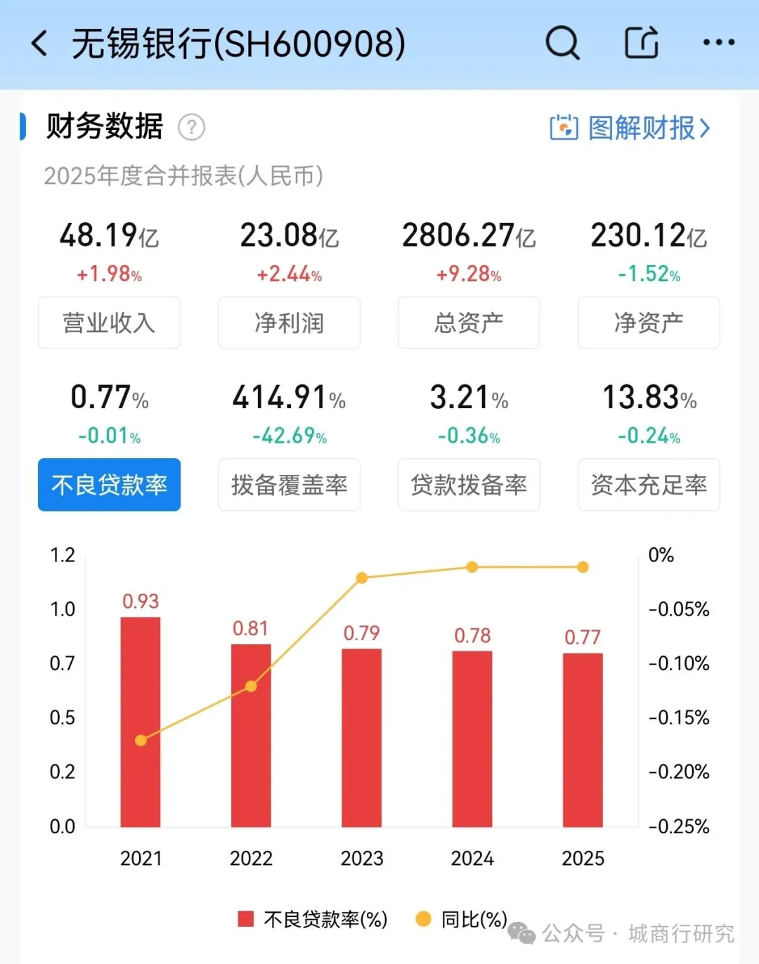 在追求效益的同时,无锡银行的风险管控能力同样出色。截至2025年末,该行不良贷款率仅为0.77%,较年初再降0.01个百分点。自2016年上市以来,无锡银行实现了连续9年不良贷款率下降,且连续5年稳定在1%以下的优秀水平。