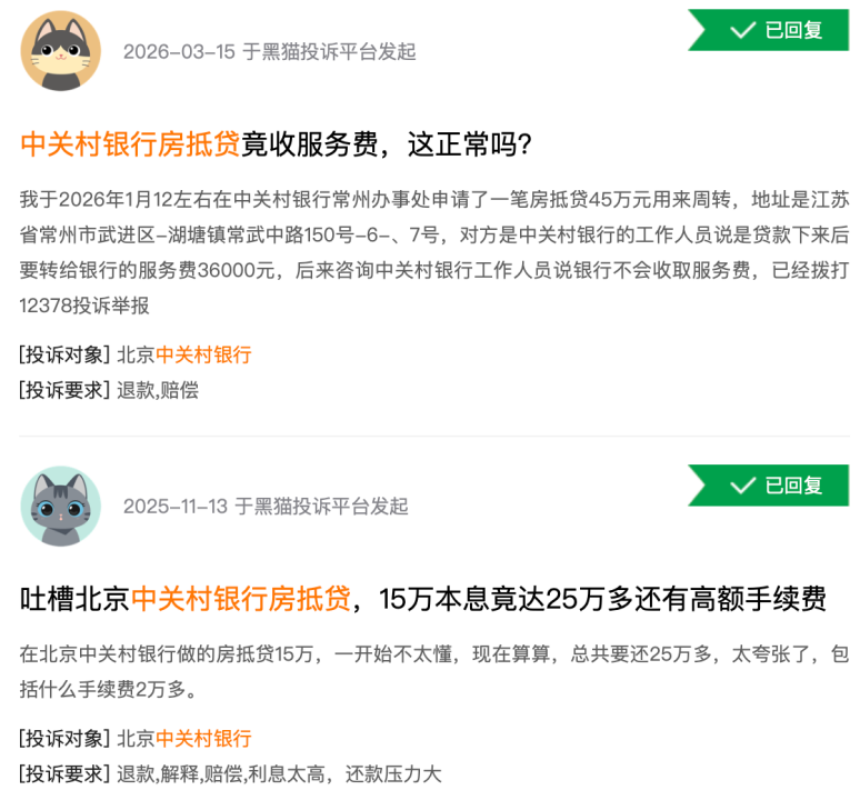 另有用户反映,在与中关村银行合作的助贷机构办理房抵贷业务时,部分合作机构会额外收取高额服务费,进一步推高了借款人的综合融资成本。