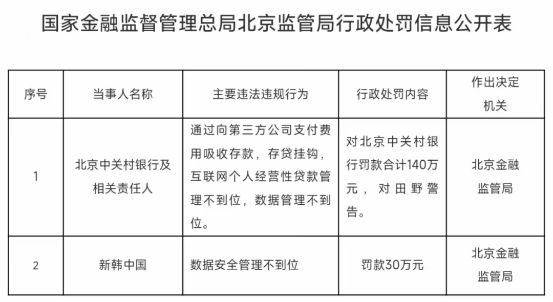 2025年9月12日,国家金融监督管理总局北京监管局披露的行政处罚信息公开表显示,中关村银行因“通过向第三方公司支付费用吸收存款,存贷挂钩,互联网个人经营性贷款管理不到位,数据管理不到位”被北京金融监管局罚款140万元,相关责任人田野被警告。
