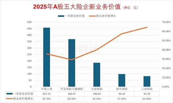 2025年,A股上市的五大保险公司一年新业务价值都实现双位数增长,其中人保寿险一年新业务价值82.29亿,增长了64.5%,新华保险一年新业务价值增长了57.4%,增幅最低的中国平安寿险与健康险的新业务价值也增长了29.3%。