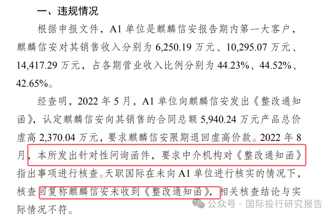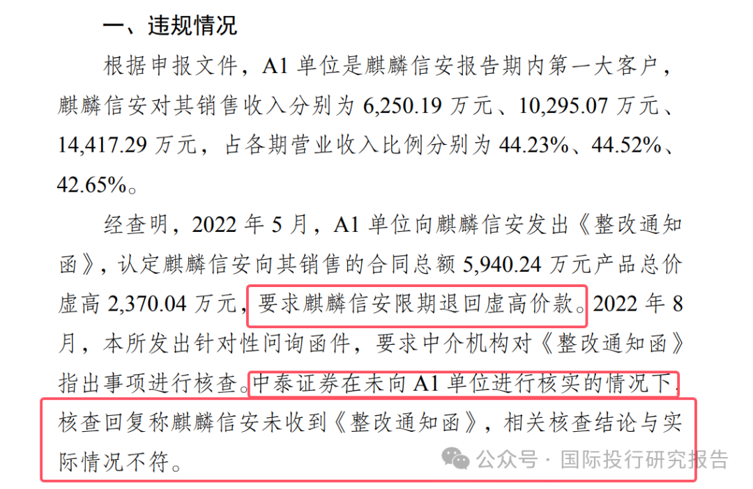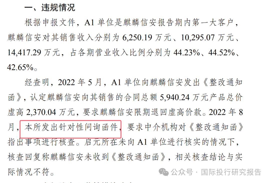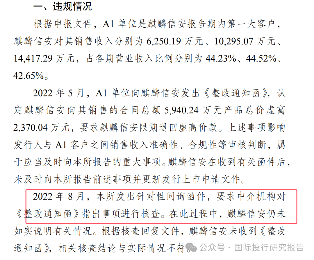- 据申报文件,A1 单位是麒麟信安报告期内第一大客户,麒麟信安对其销售收入分别为 6,250.19 万元、10,295.07万元、14,417.29 万元,占各期营业收入比例分别为44.23%、44.52%、42.65%。 经查明,2022 年 5 月,A1 单位向麒麟信安发出《整改通知函》,认定麒麟信安向其销售的合同总额5,940.24 万元产品总价虚高 2,370.04 万元,要求麒麟信安限期退回虚高价款。