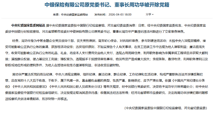中银保险原董事长周功华被开除党籍:涉六大问题