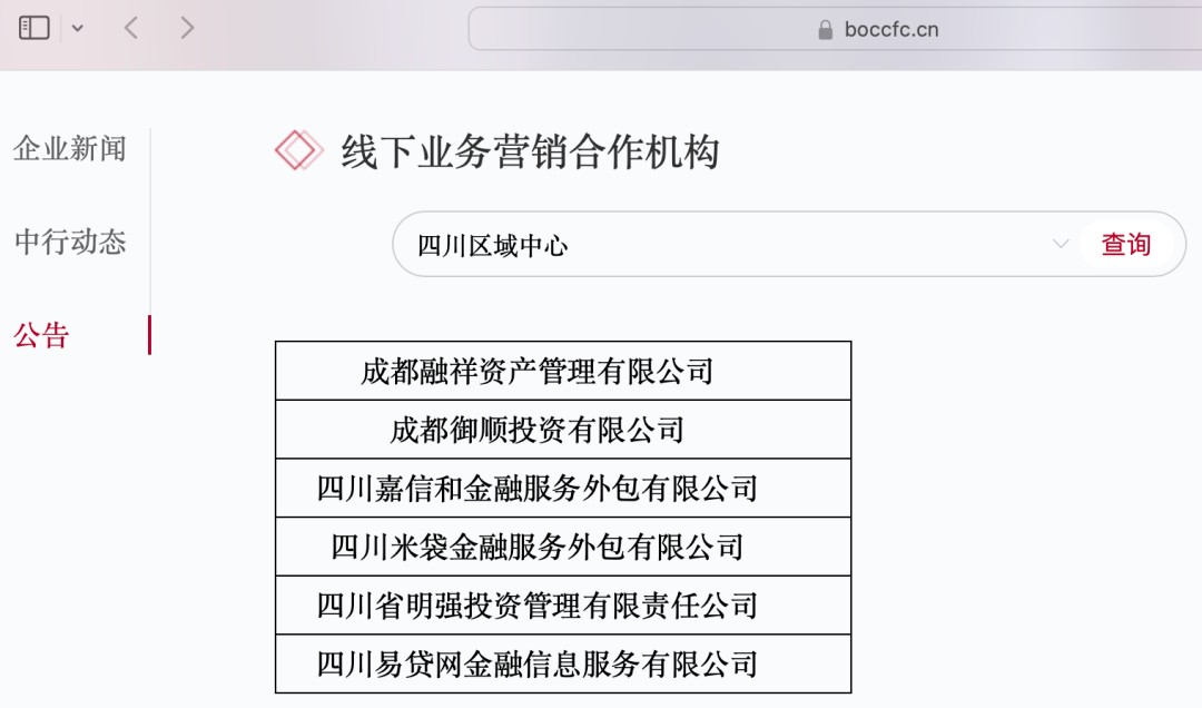 截至发稿前,中银消金已在全国设有23个区域中心,线下业务营销合作机构103家。例如,查询四川区域中心发现,中银消金与6家四川线下机构合作放贷。其中,四川米袋金融服务外包有限公司、四川易贷网金融信息服务有限公司为四川本土头部贷款中介。